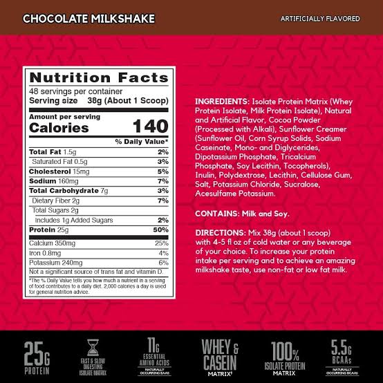Cada porción de Matriz de Proteína Aislada: una matriz de proteínas de liberación rápida y lenta provenientes de fuentes de aislado de proteína de suero y aislado de proteína de leche, contiene 25 g de proteína, Matriz de Aislado de digestión rápida y lenta, y 11 g de aminoácidos esenciales naturales por porción.